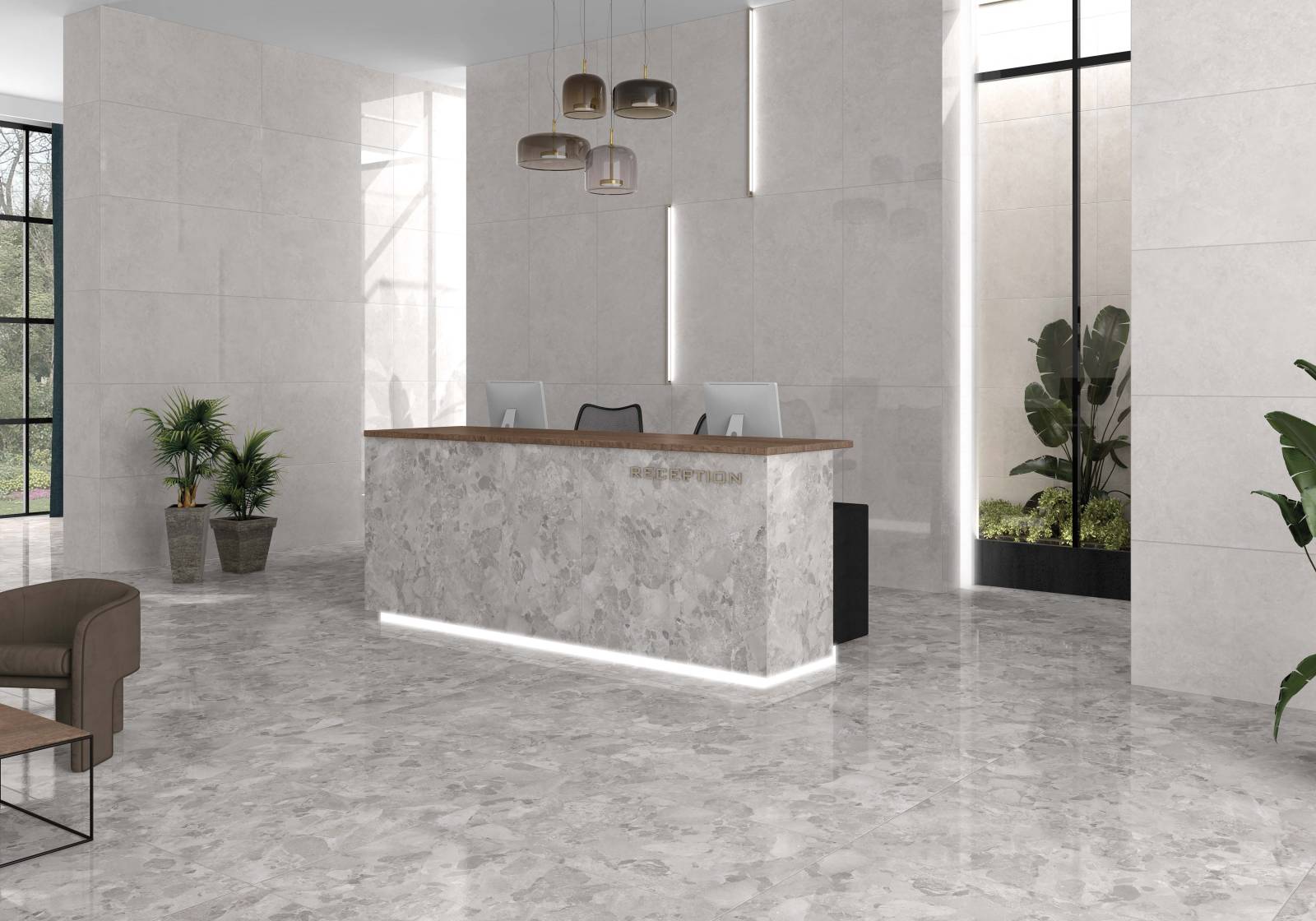 La surface polie réfléchit la lumière, créant une illusion visuelle d'agrandissement de l'espace, idéale pour les espaces plus petits ou ceux où une atmosphère aérée est souhaitée.