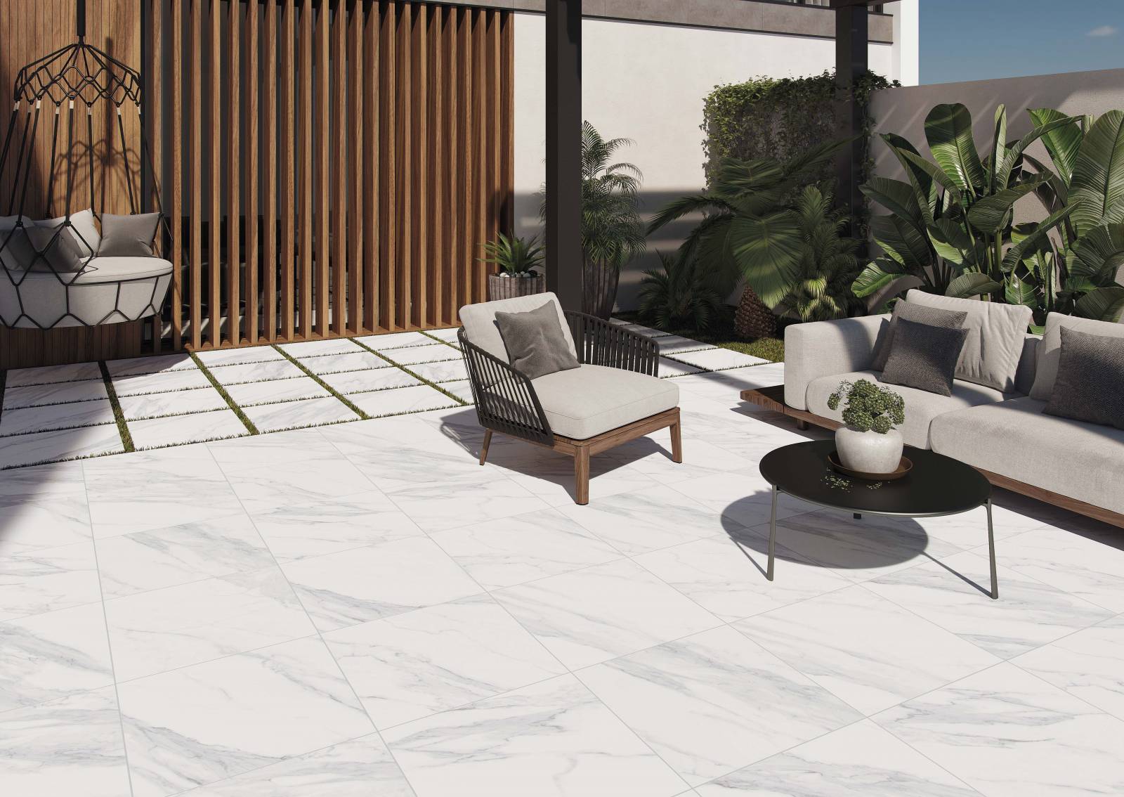 La résistance et la durabilité de ce carrelage en font un choix idéal pour les terrasses, les piscines, les allées et les autres zones extérieures. Il est conçu pour résister aux rayons UV, aux variations de température, aux intempéries et à l'humidité, ce qui lui permet de conserver son apparence et sa qualité exceptionnelles au fil du temps.